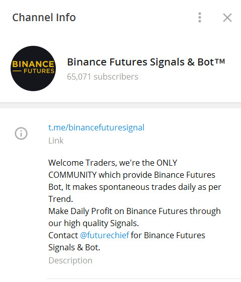 Largest Crypto Trading Group providing Free Crypto signals for Binance Futures,Bybit with around 80-90% accuracy.We also provide Binance Future BOT which execute trades in our live master accounts using our capital. Then through cutting edge technology, our Binance Futures Bot copies the trade on your account - It is all automatic without any manual intervention