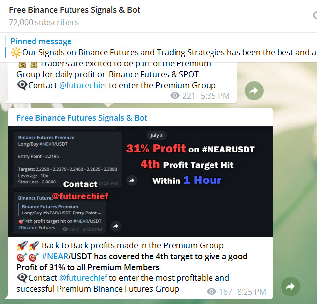 Largest Binance Futures, Bybit, WazirX, Coinswitch, CoinDCX Signals Group on Telegram in 2021. We send daily 4 to 5 high quality Signals around 80-90% accuracy. Our Signals & Trading Strategies has been the best and appreciated by tons of Traders.