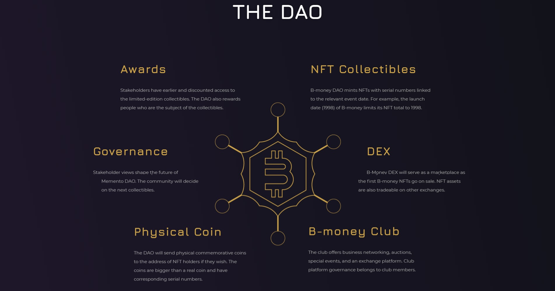 Memento CC is the first digital adaptation of the Mint’s Commemorative Coin. The first cryptocurrency of the B-money DAO is B-MONEY. The DAO and pioneer Memento CC take their names from Wei Dai's 1998 b-money project which inspired Satoshi Nakamoto while creating Bitcoin and the blockchain in use today.