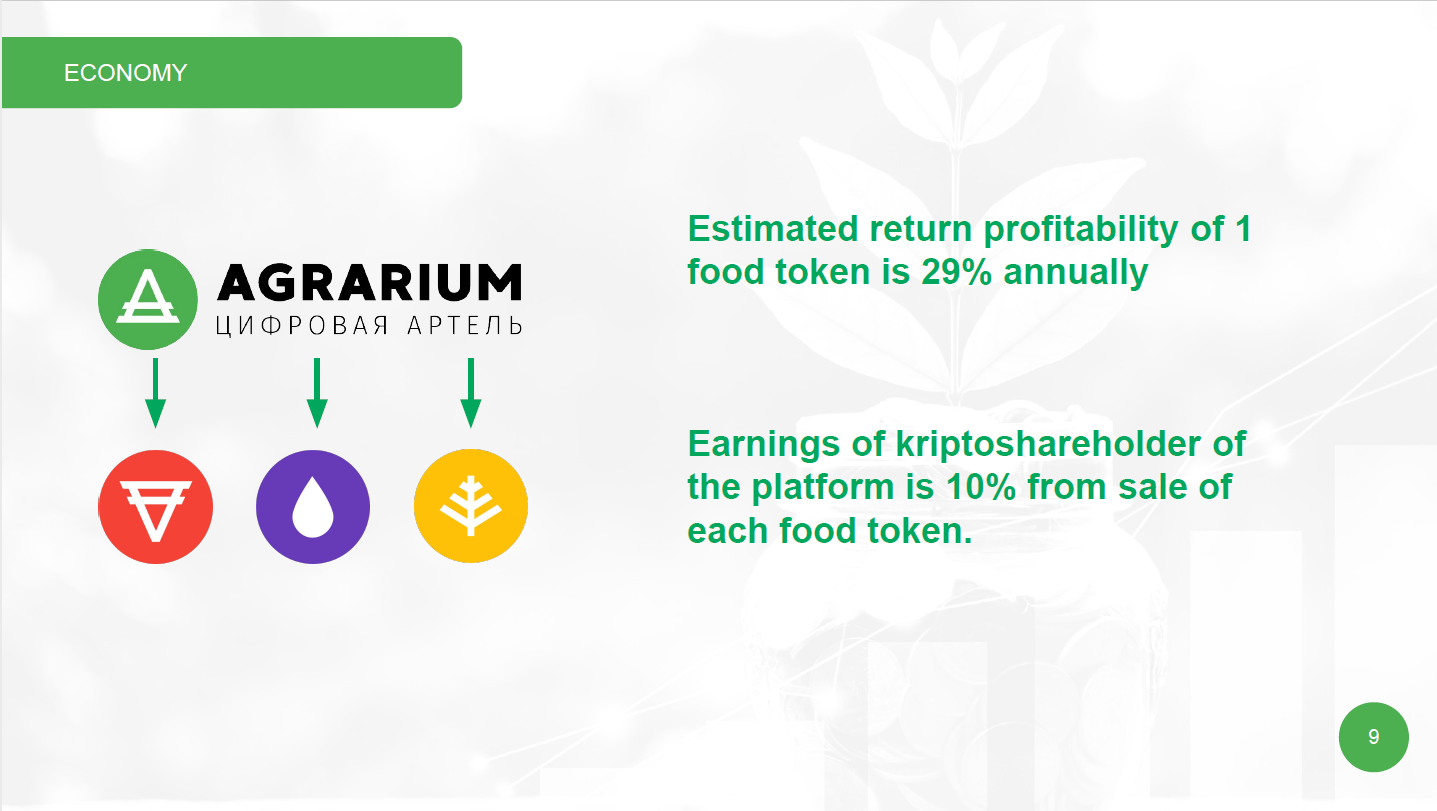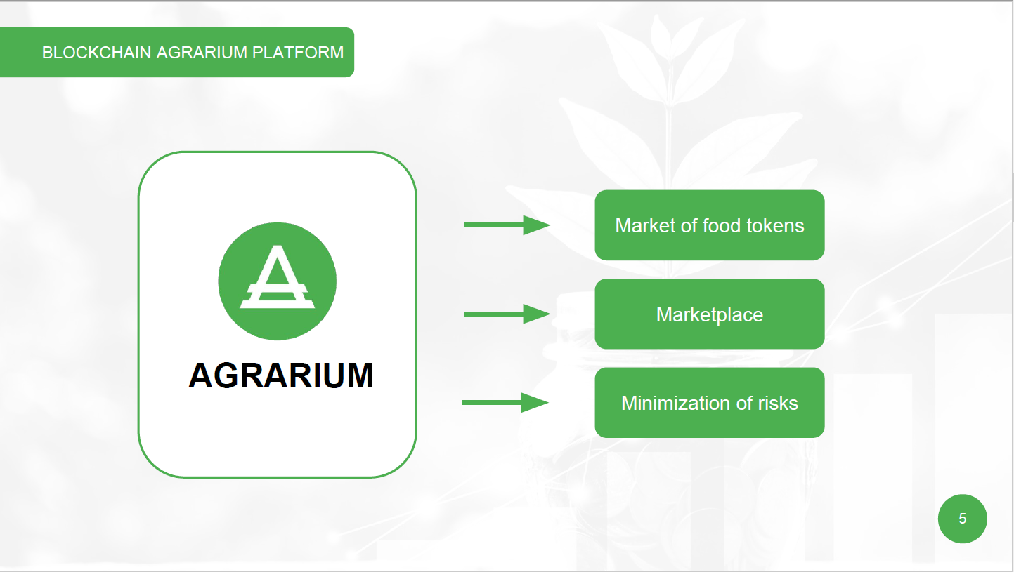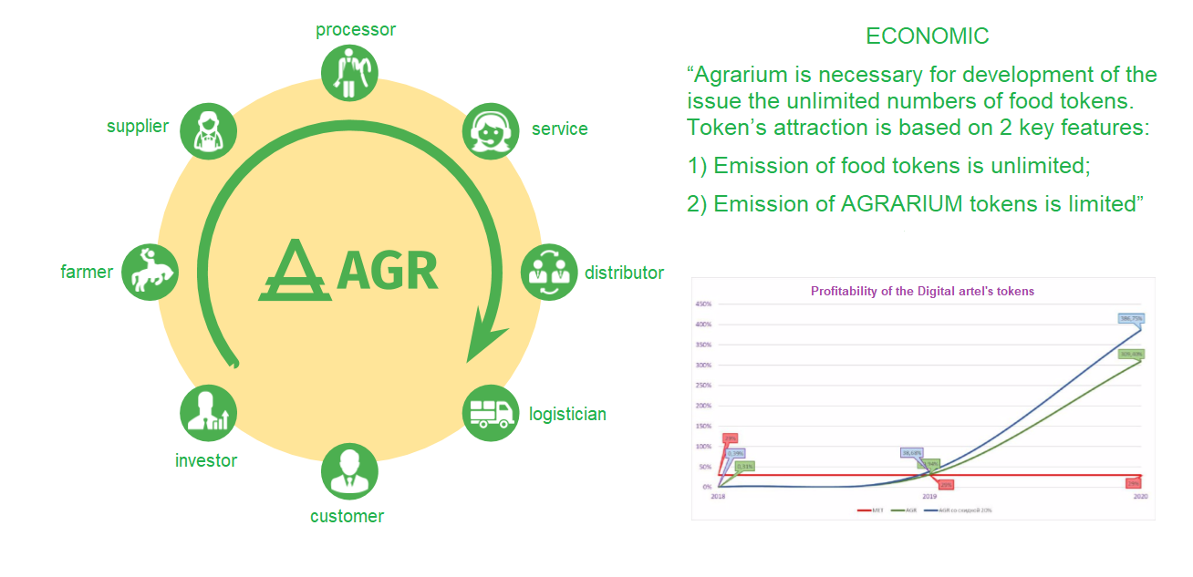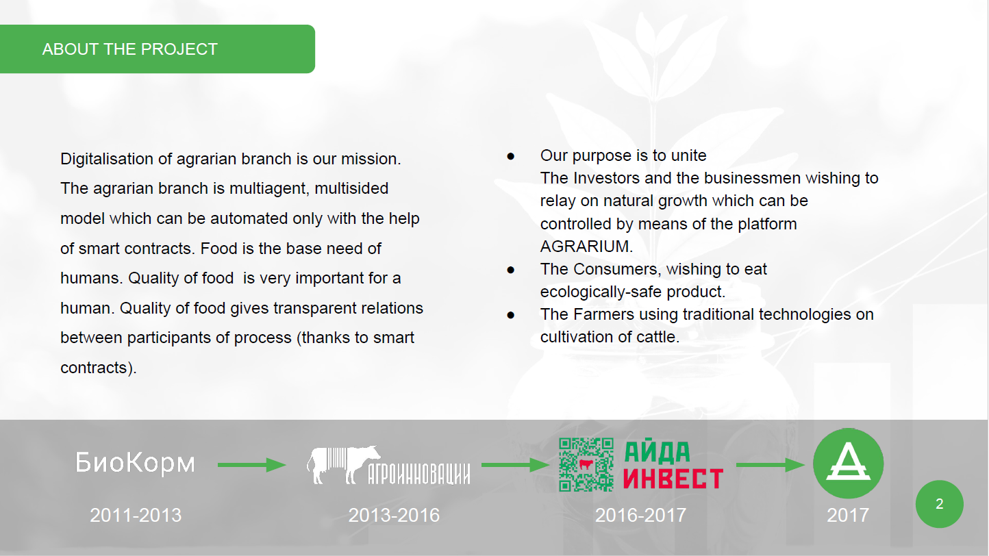 Our goal is to create the blockchain platform with the help of high technologies in digital economics for implementing the ITO (Initial Token Offering) together with the inner exchange of farm produce tokens and with the risk minimization system.
