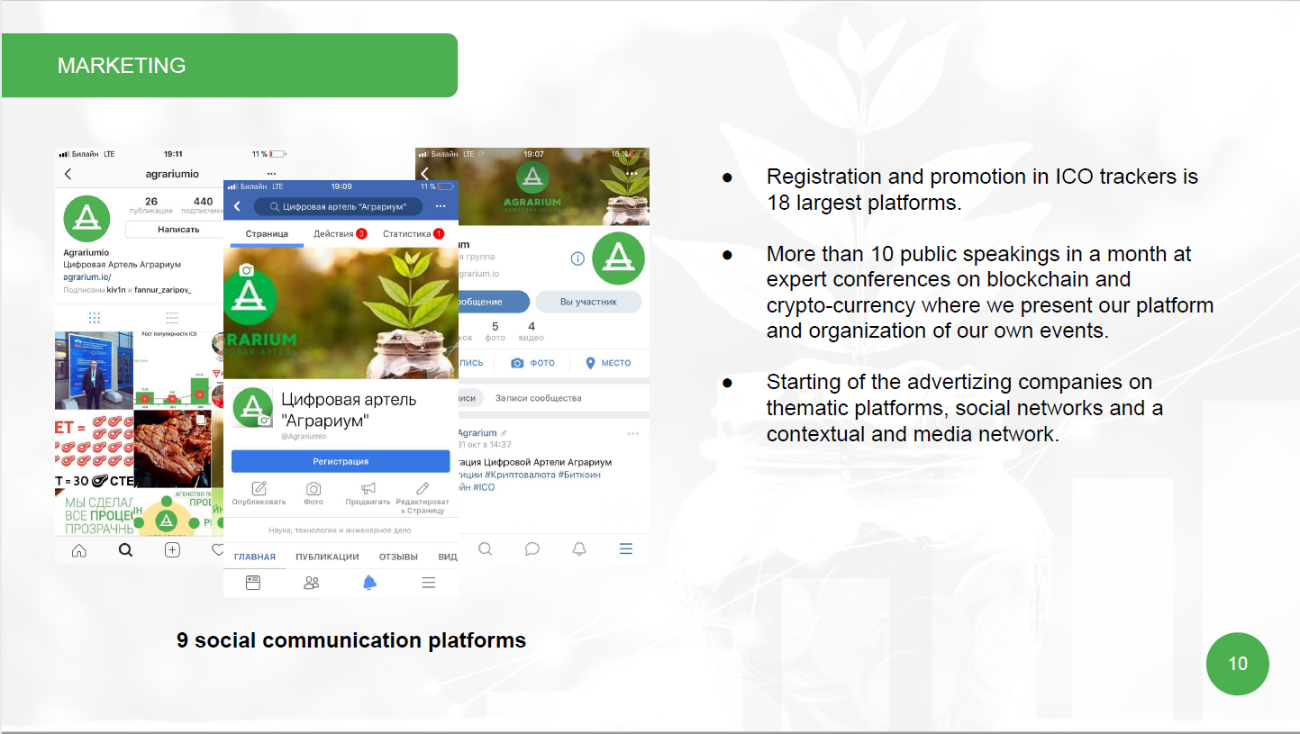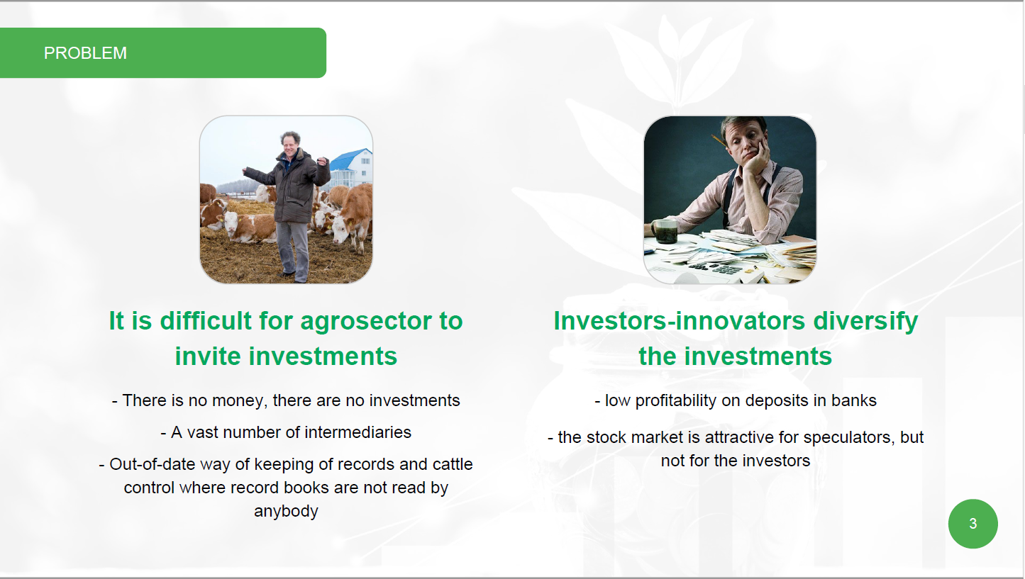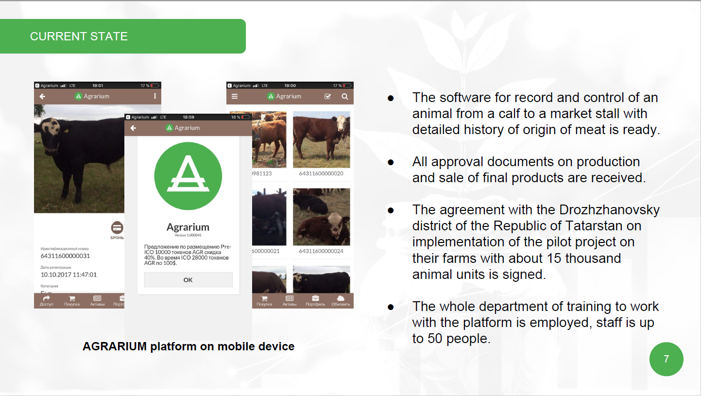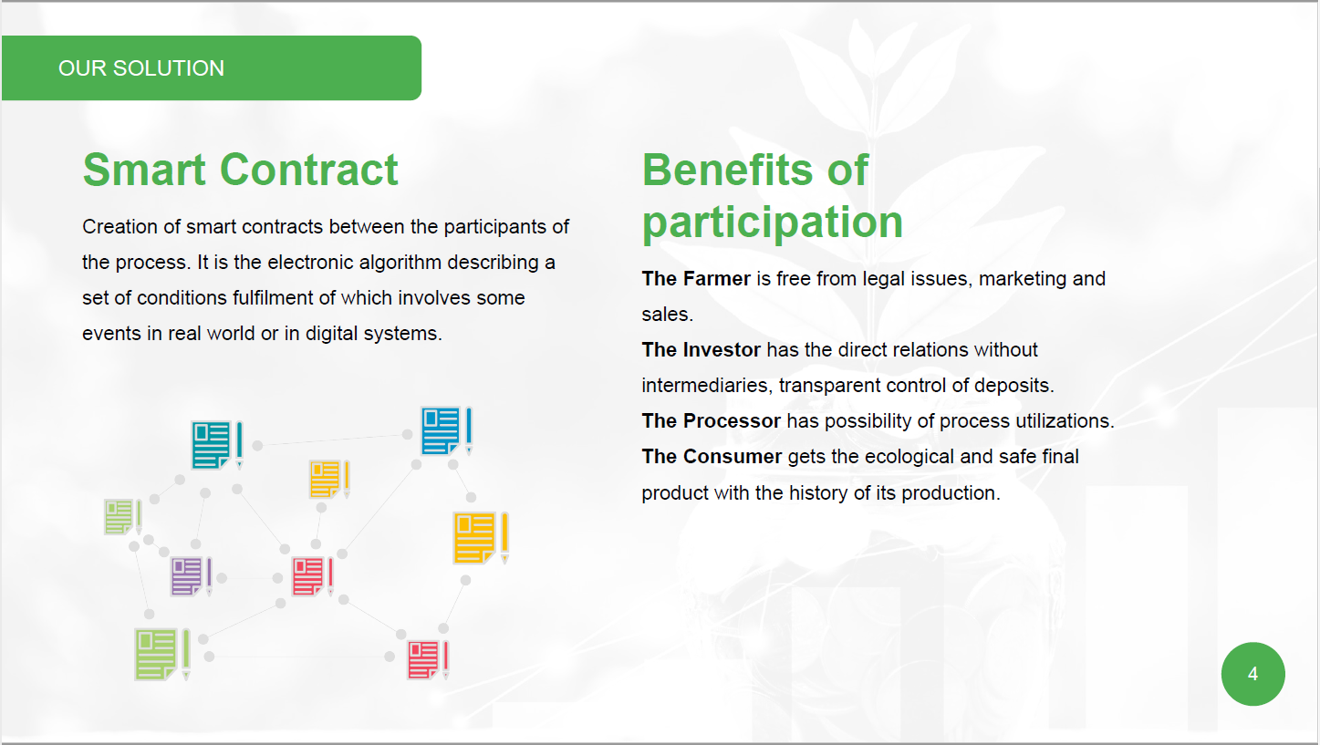Our goal is to create the blockchain platform with the help of high technologies in digital economics for implementing the ITO (Initial Token Offering) together with the inner exchange of farm produce tokens and with the risk minimization system.