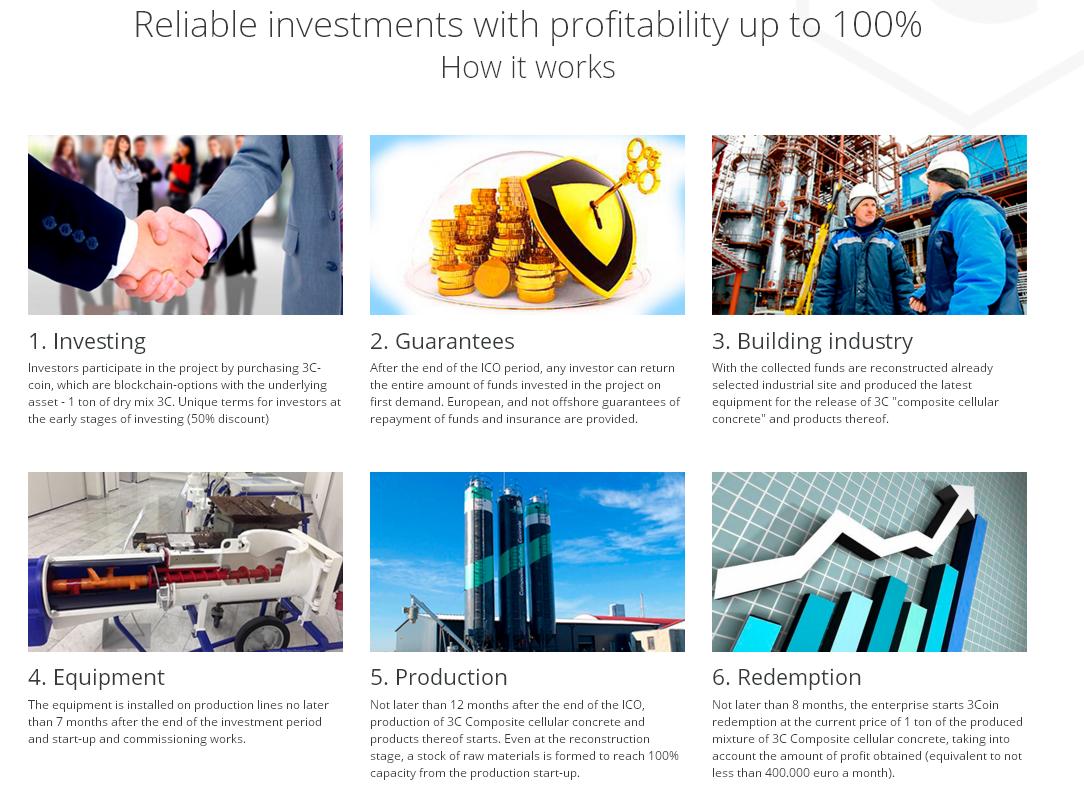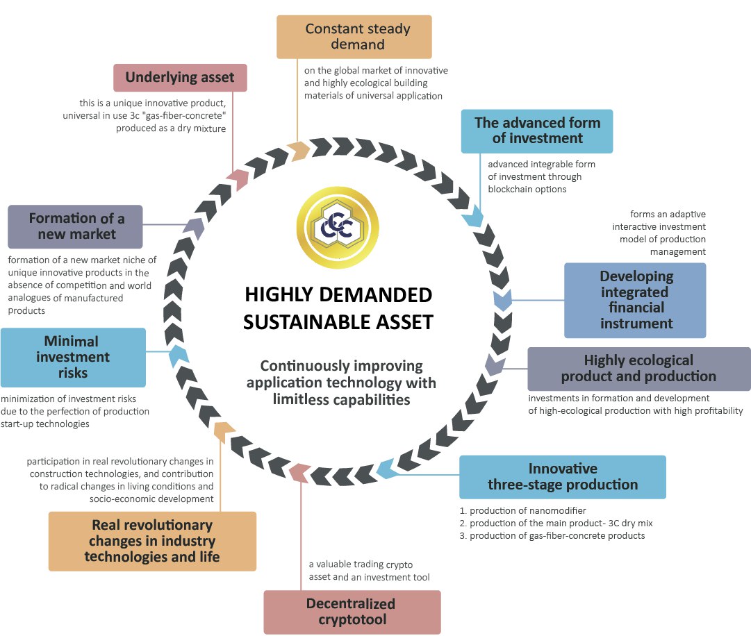 The project involves crowdfunding investments in the derivative 3cCoin, which is implemented in the form of a financial instrument developed on the WAVES blockchain - platform and secured by a unique innovative and highly sought - after industrial product - 3C (Composite Cellular Concrete) "gas - fibre concrete".