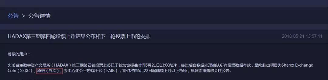 2018年5月21日,原链YCC以265585366 票夺得火币HADAX投票榜亚军,原链YCC社区感谢广大支持者的投票,相信未来,原链YCC将会再创高峰,缔造佳绩。