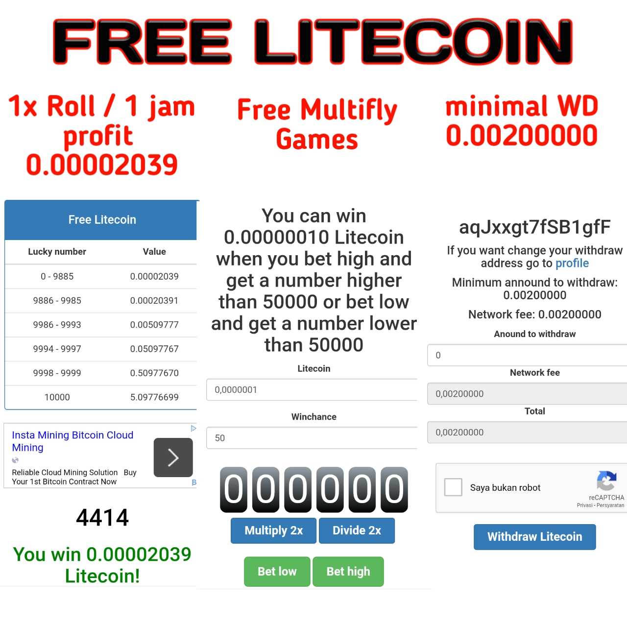 1x Roll / 1 hour profit 2041satoshi up to 5.1 LTC (MIN. WD 0.00200000 LTC)