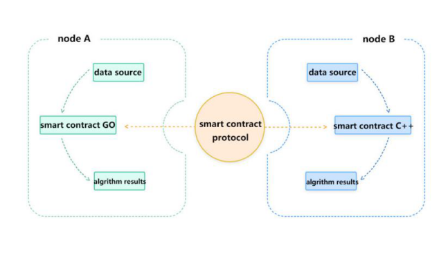 Yuan Chain community does not follow “Code is law”, different codes can be applied on the same node following the same rule (different codes developed by different development team). As long as the rule is constant, the same result will show after execution of the smart contracts. For example, say the outcome for “1+1” is to be computed, Yuan Chain community can use different programming language C++ or Go, the results will be the same if the same rule is applied.